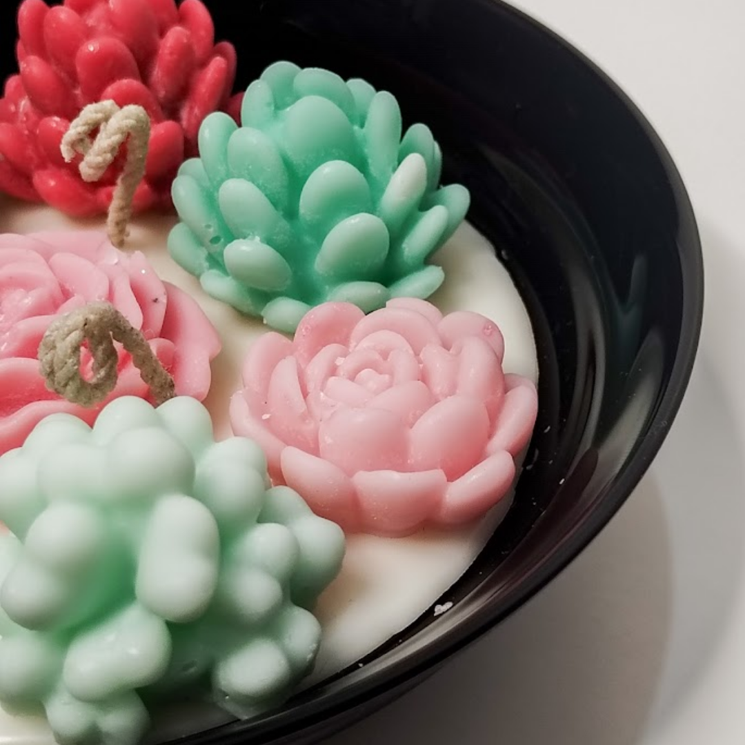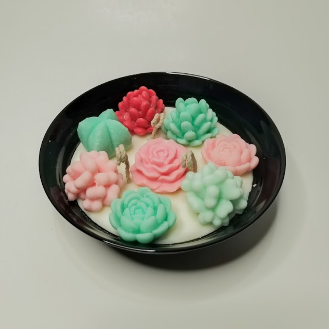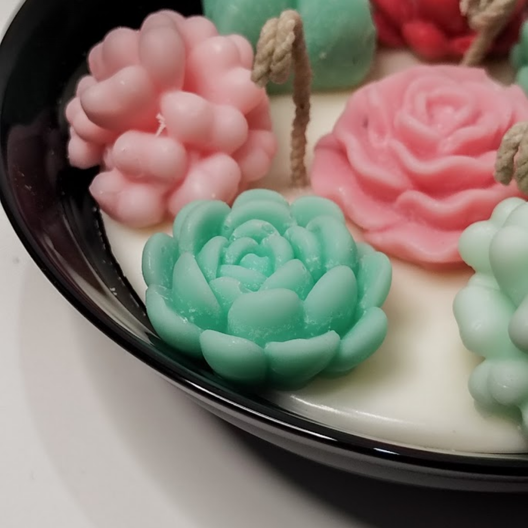 Vela en platito con mini suculentas – Jardín decorativo de cera vegetal | Producto artesanal colombiano